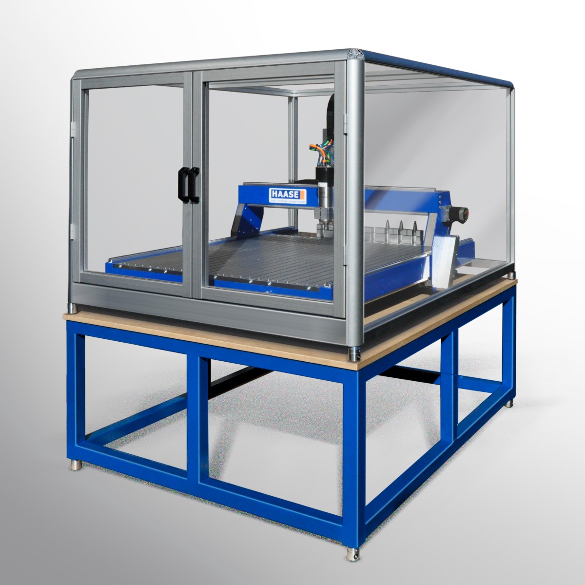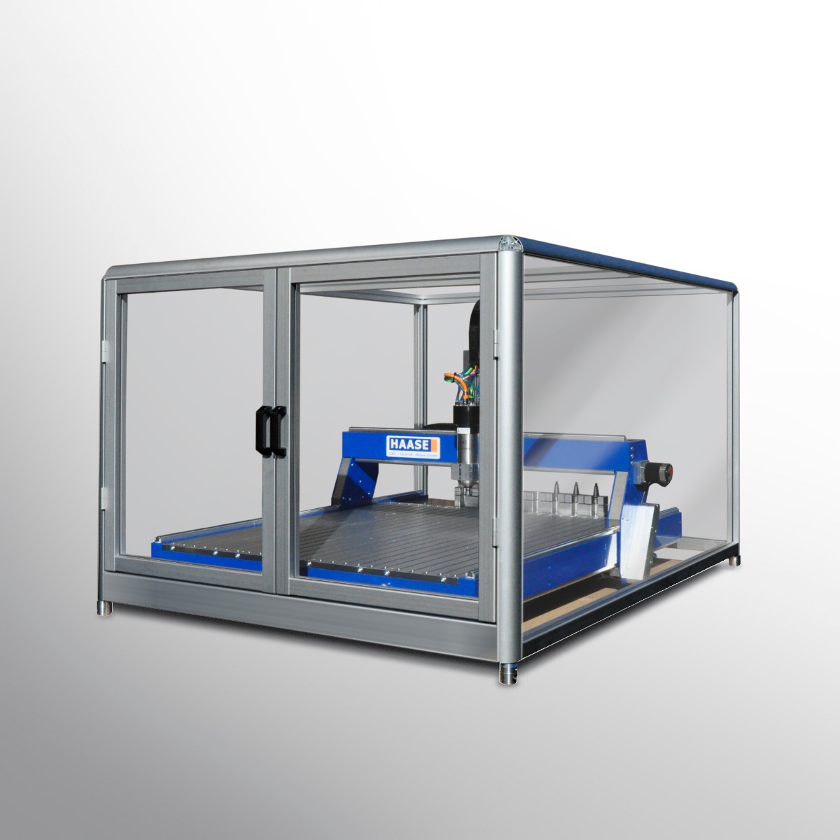 - Vollkapselung der Maschine: Die komplette Umhausung aus Aluminiumprofilen und Makrolonscheiben bietet zuverlässigen Schutz und ermöglicht eine klare Sicht auf die Maschine.
