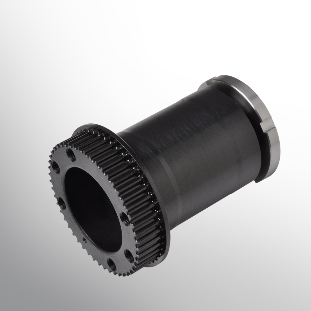 Hier handelt es sich um eine Aufnahme für eine Kugelumlaufmutter nach DIN 16mm. Der Rotationskörper wurde aus dem vollen gefertigt, die Verzahnung wurde auf einem BAZ aufwendig mit sehr enge Toleranzen gefertigt. Hiermit ist sichergestellt das der typische Umkehrschlupf der bei standard Riemenrädern auftritt praktisch gegen Null geht! Qualität und Präzision sind also kein Zufall....