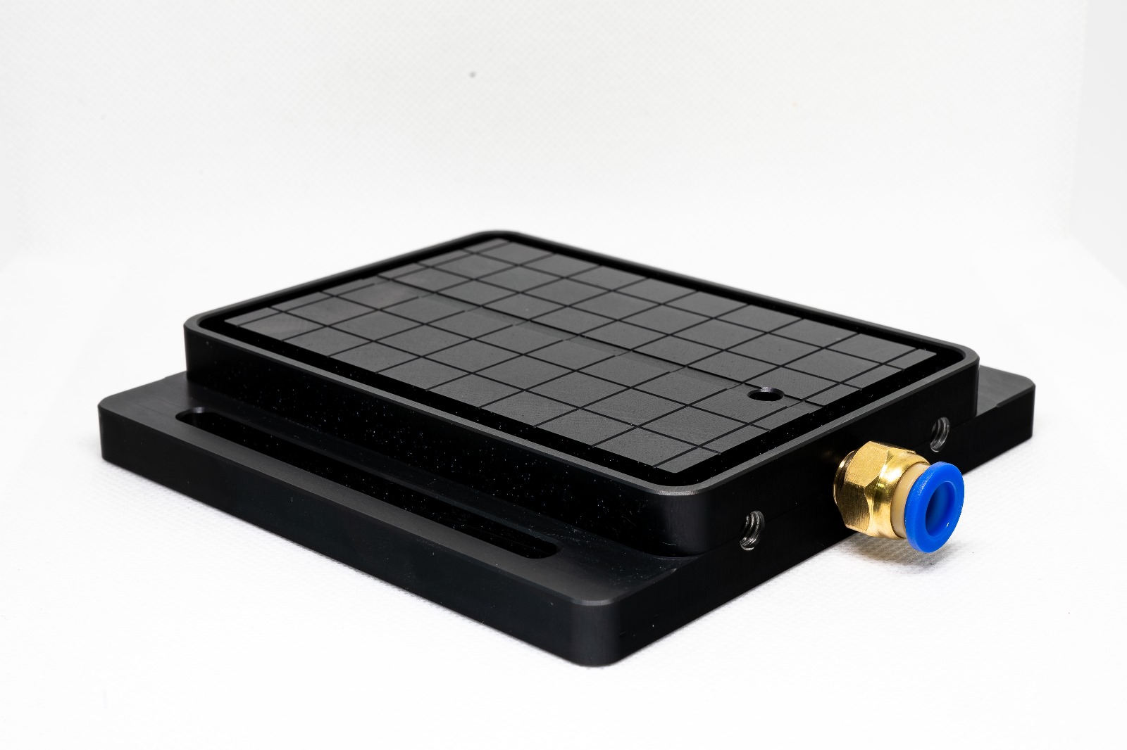 Gefertigt aus eloxiertem Aluminium, Aussenmaß 118 x 118 x 20 mm und ist für den Einsatz mit Kühlmitteln geeignet. Integrierte seitliche Befestigungsmöglichkeit für M6 Schrauben. Ideal für den Einsatz auf CNC Maschinen.